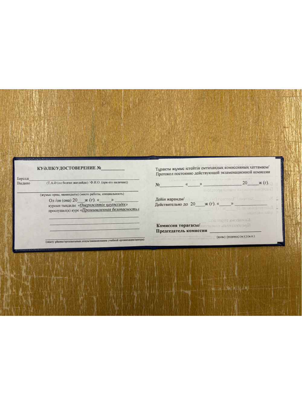 Удостоверение о проверке знаний промышленной безопасности (Каз. и Рус. яз.)