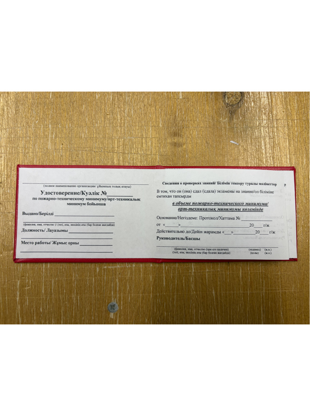 Удостоверение о проверке знаний в области пожарной безопасности в объеме пожарно-технического минимума (Каз. и Рус. яз.)